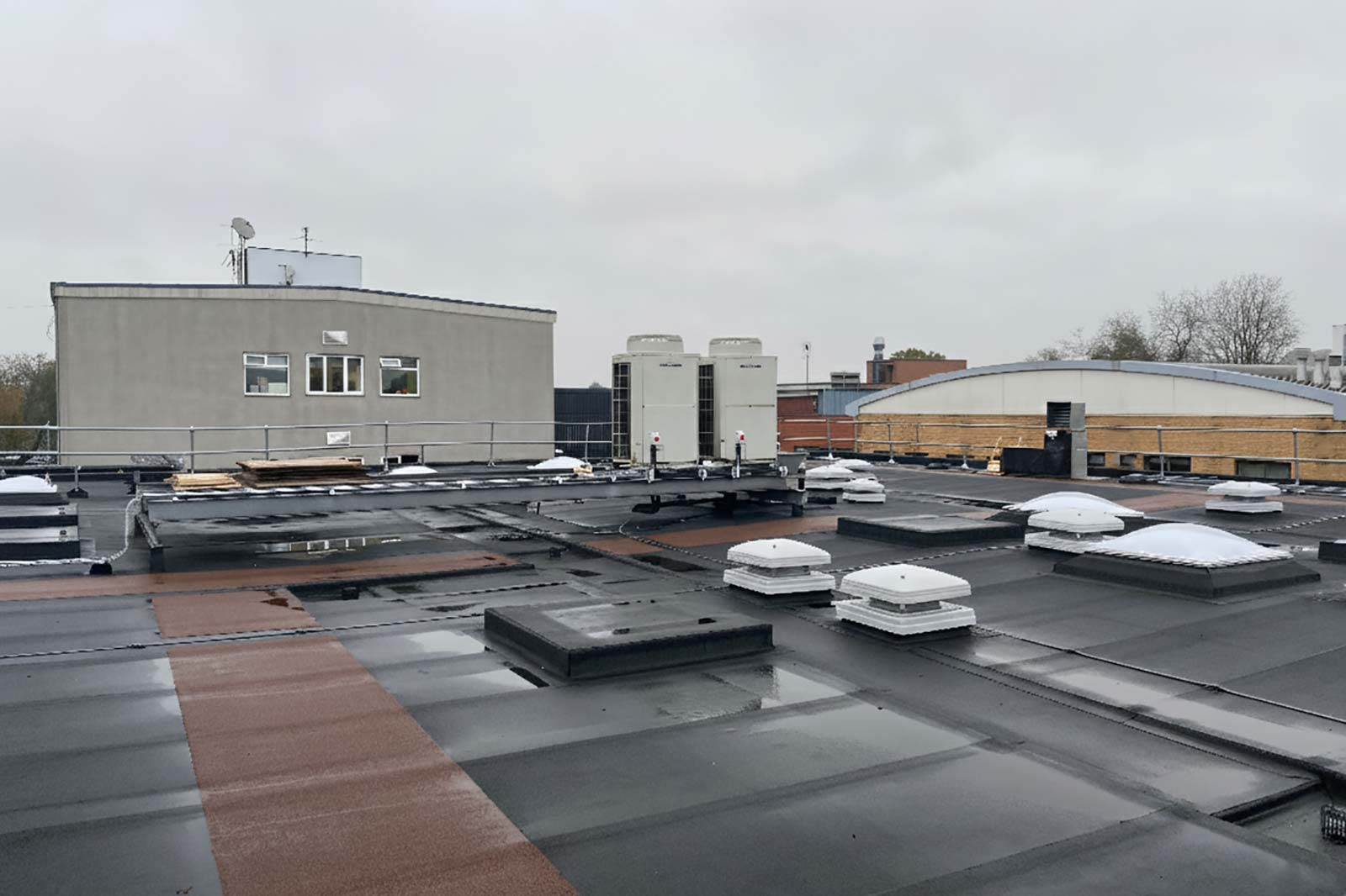 To facilitate the roof refurbishment, a considerable amount of electrical and piped distribution needed to be dismantled, along with ductwork, air handling units, and DX heating/cooling systems. The services had to be drained and secured, and ductwork ends prepared to enable the roof replacement, followed by the reinstatement of the relevant services once the roofing was completed.