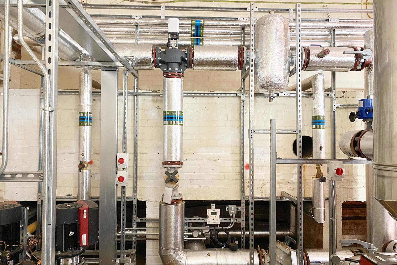 The old heating boiler and circulation plant were in poor condition and were replaced, along with pumps and pressurisation equipment, and new interconnecting pipework systems were installed. The new pipework installation was particularly challenging due to the presence of asbestos in the plantroom. The walls had been treated, meaning that no bracketry could be fixed to the walls. A new framework was constructed to support the pipework from the floor to eliminate the requirement for penetrative fixings into walls.