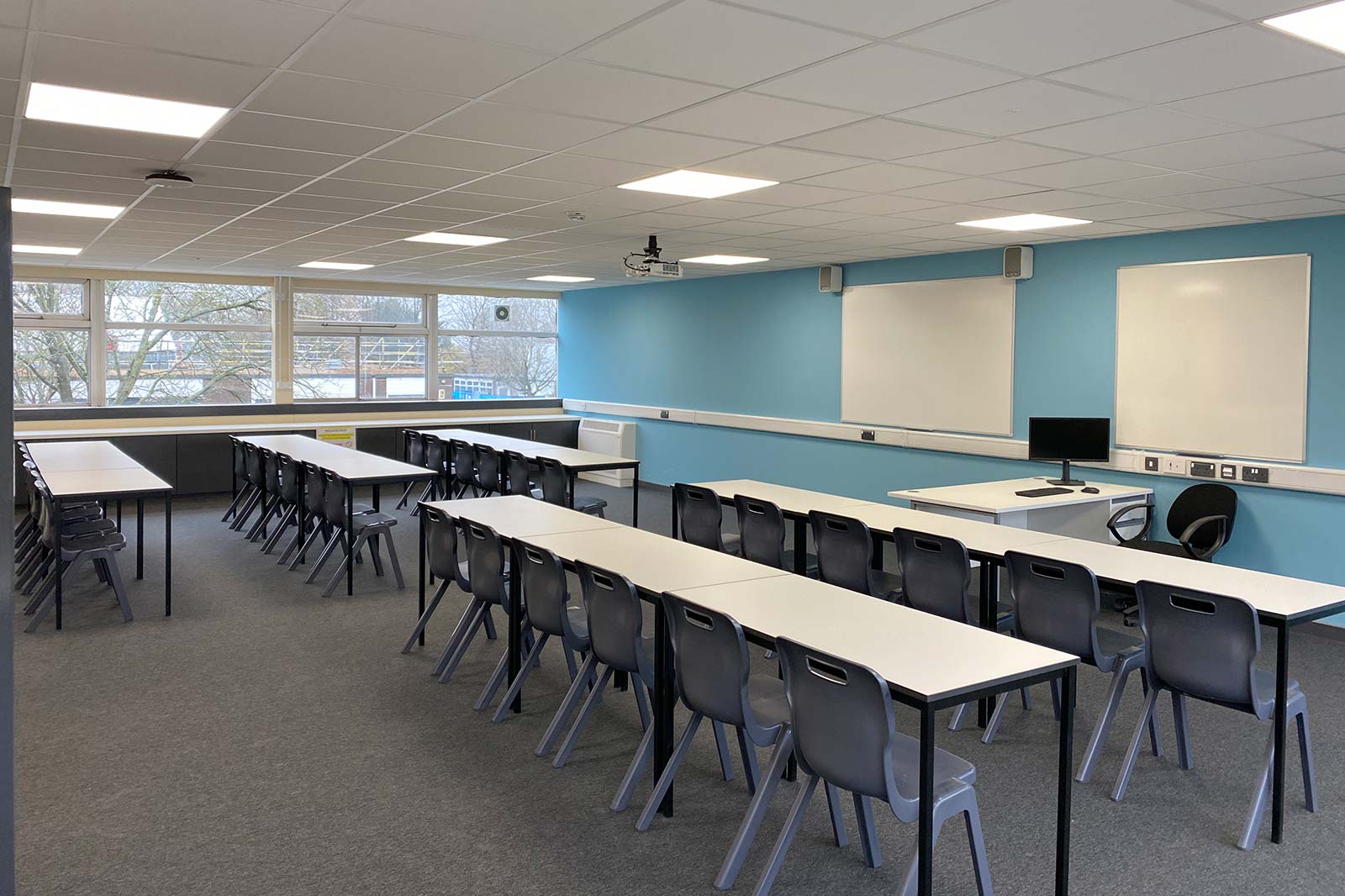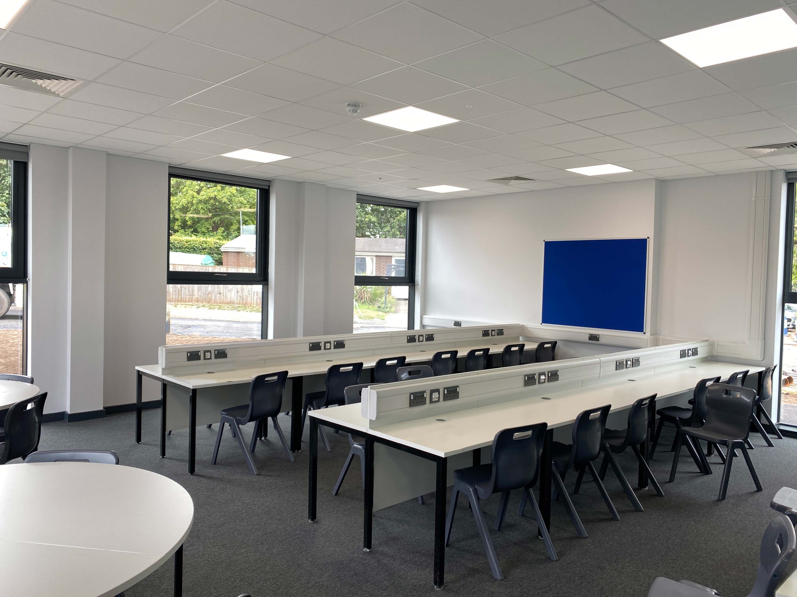 These spaces were extensively refurbished with new, modern wall and ceiling finishes, and new heating, LED lighting, power and data services installed to suit the new classroom layouts and to facilitate the installation smart teaching walls. Existing ventilation systems were renewed.